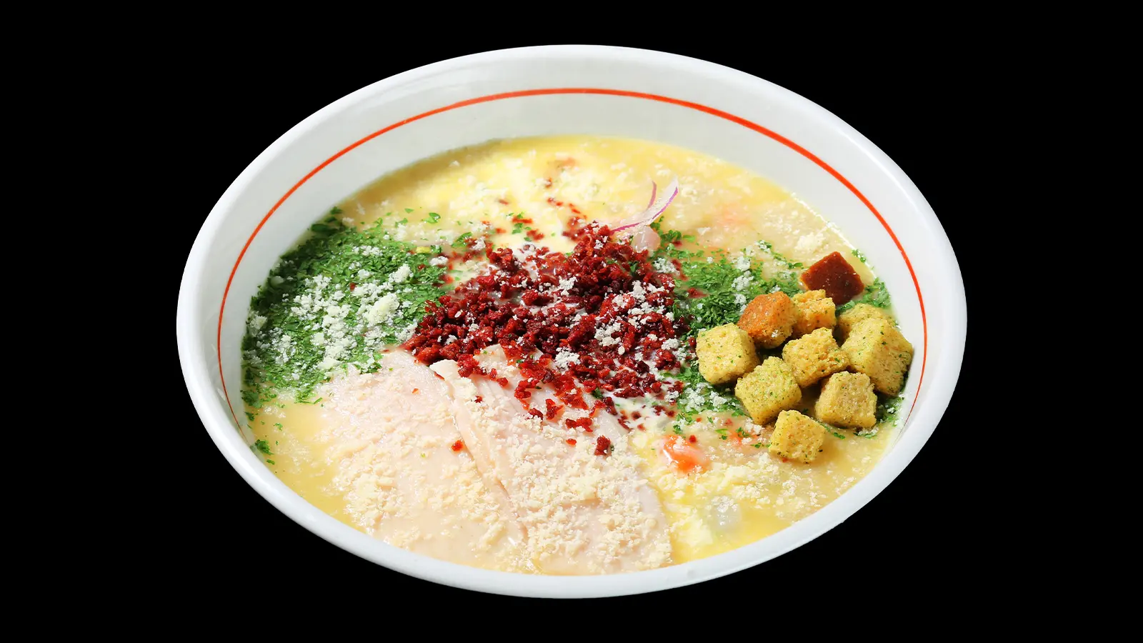 ベースはクラムチャウダーと鶏白湯を合わせ、チーズ・玉ねぎ・炒めたベーコンをトッピング。仕上げに鶏チャーシューをのせた特製ラーメン。